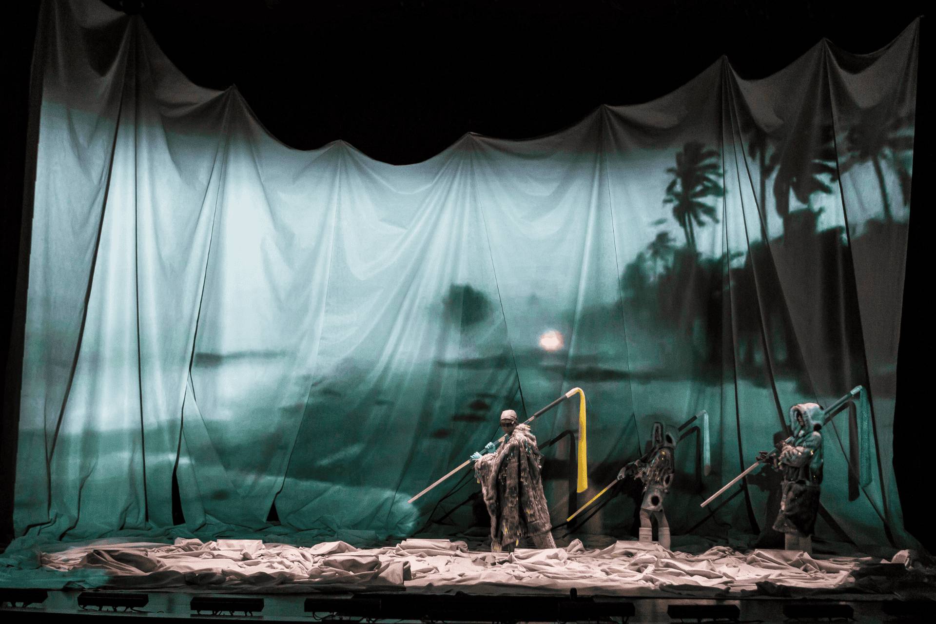 “The curtain rises to reveal a scene reminiscent of a distorted nativity: 16 figures in coloured robes, red glasses and crooked staffs. They remain motionless, imposing. Then they sing, while the large screen projects striking images. Voices, images and figures merge into an intangible substance that envelops the audience for the next hour and a half.”