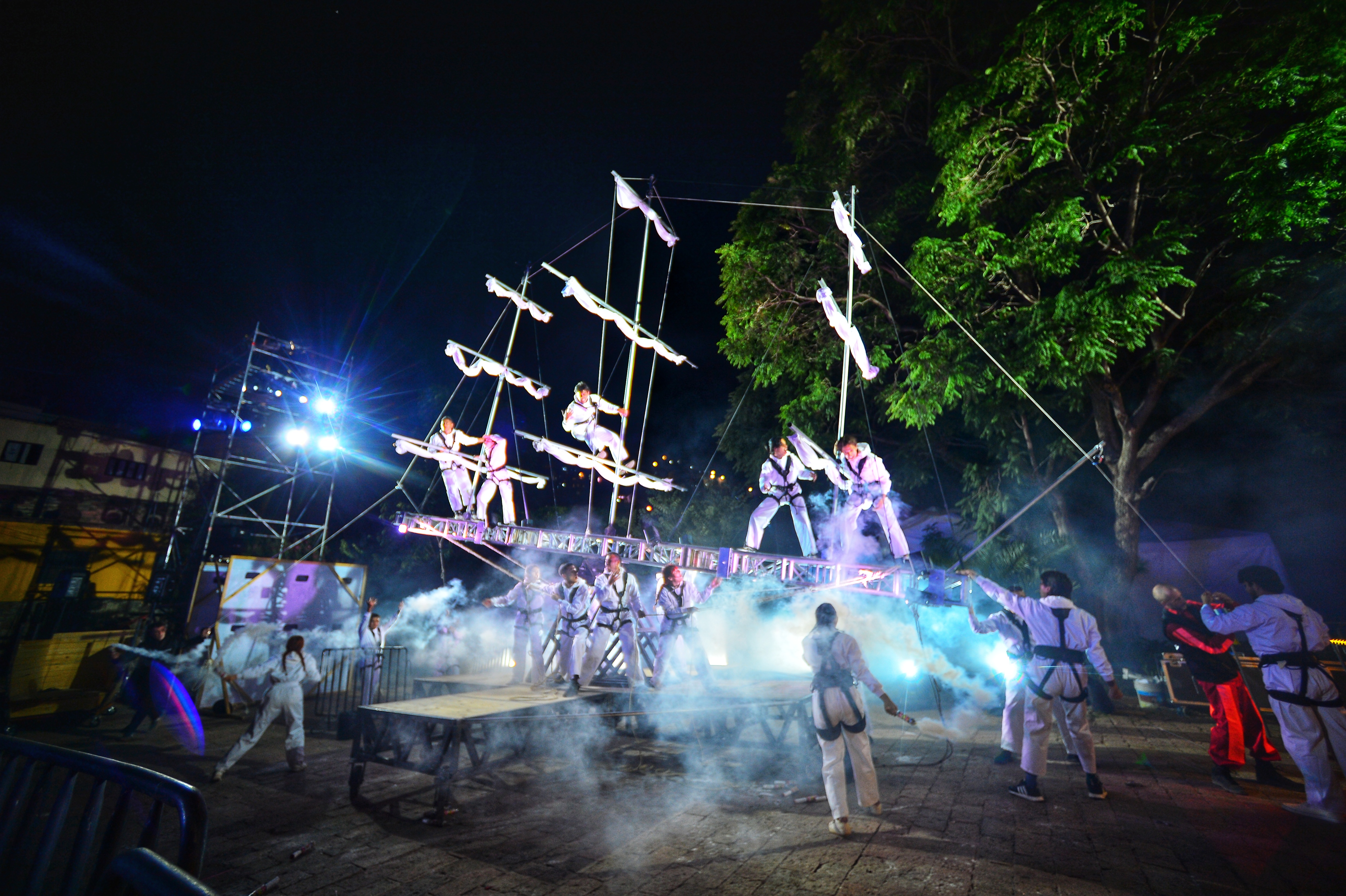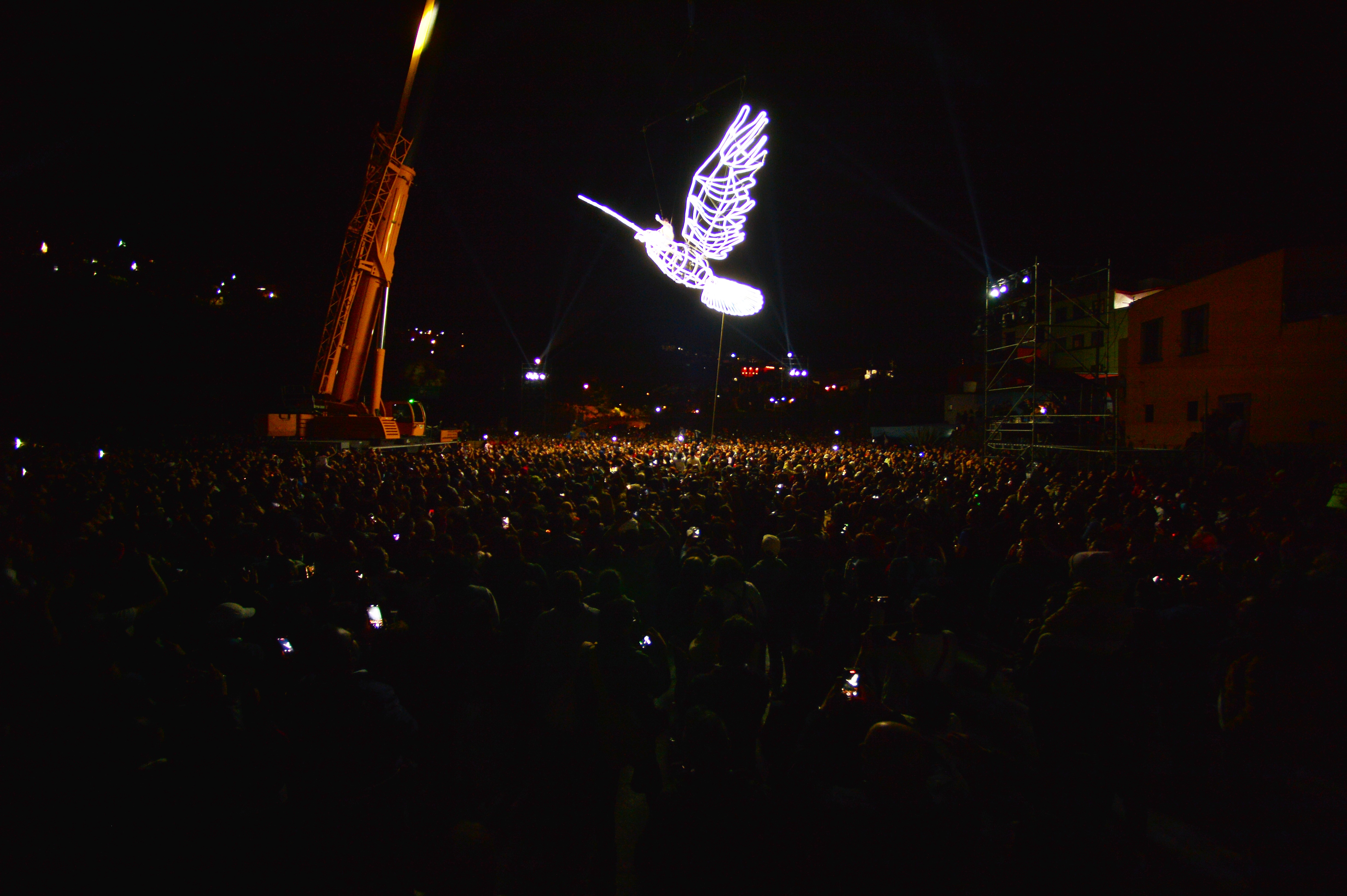 De pronto, las luces se apagaron. El canto de unos grillos seguido del croar de unas ranas marcó el inicio de este espectáculo en el que el público presenció, entre otras cosas, un barco con navegantes que se roban el oro de las minas de Guanajuato, la toma de la Alhóndiga de Granaditas con la gesta del Pípila, una soprano que apareció montada en un ave gigantesca, entonando una canción de paz.