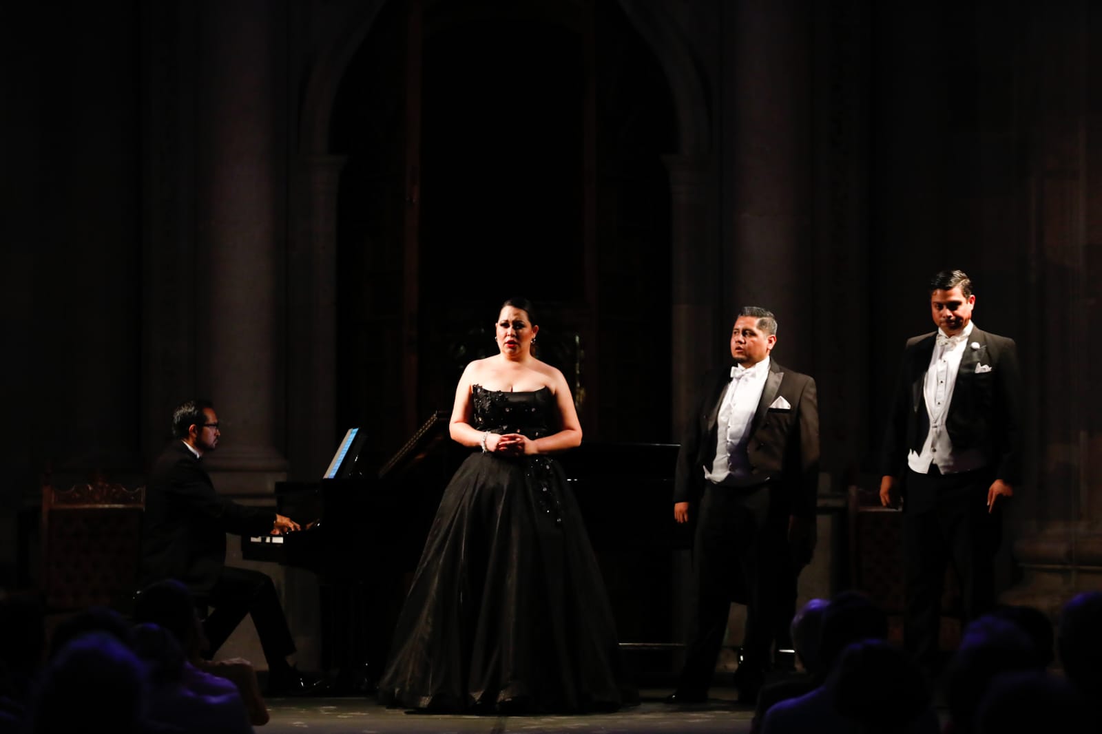 El pequeño escenario de la Pinacoteca del Templo de la Compañía de Jesús Oratorio de San Felipe Neri, sirvió como cápsula del tiempo para volver al pasado a través de la música clásica, a cargo de los cantantes sonorenses Ernesto Ochoa, Cesia Moroyoki y Luis Castillo. El primero de ellos alternó su turno a un costado del piano con Cesia Moroyoki, para entonar temas como Parle moi de la mére!, de la ópera Carmen, y Despedida, de la compositora mexicana María Grever.