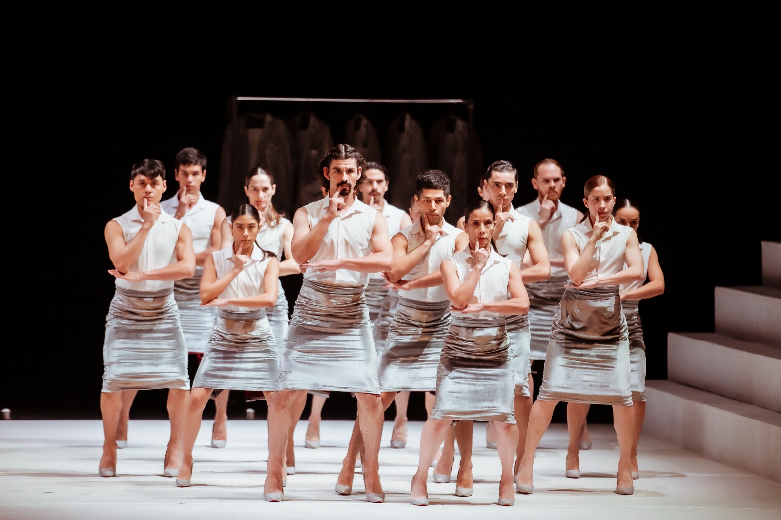 Esto se logró mediante movimientos cortados y robóticos, calidades repentinas y traslados del peso que provocaban vértigo en el espectador. Los tobillos de los 15 intérpretes se mantuvieron en una dualidad de firmeza y fragilidad, al tener que permanecer sobre un par de stilettos en la mayor parte de la obra.